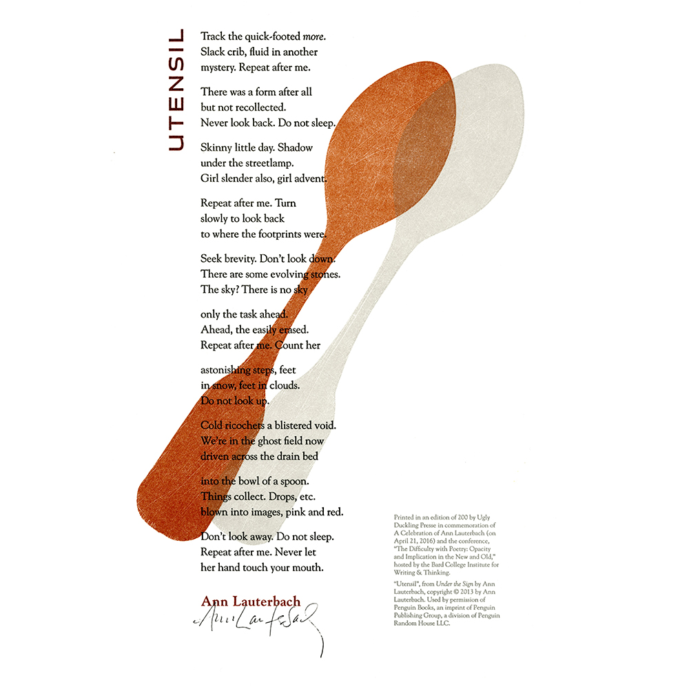 Available for sale are signed limited-edition broadsides of an Ann Lauterbach poem, produced exclusively for the 2016 IWT April Conference, “The Difficulty with Poetry: Opacity and Implication in the New and Old,” by Ugly Duckling Presse. $10